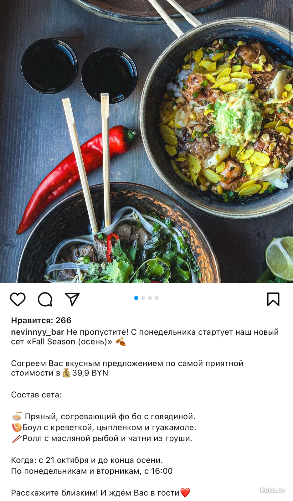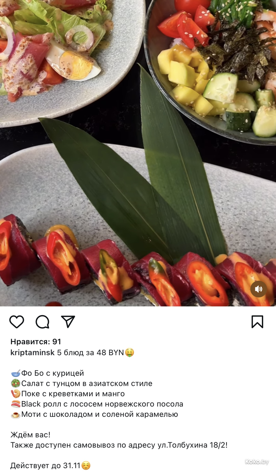 Модная нынче тема, когда тяжело привлечь новых гостей. Идея - рабочая, простая и понятная: за фиксированную сумму предлагается количество еды в граммах, самые рискованные пишут большие веса, чтобы нас соблазнить. В кафе «Крипта» регулярно практикуют такие акции, в этот раз за 48р они готовы отдать с кухни суп Фо Бо, салат с тунцом, поке с креветкой, ролл с лососем и моти. Щедрейшее предложение по цене грозди японского винограда.