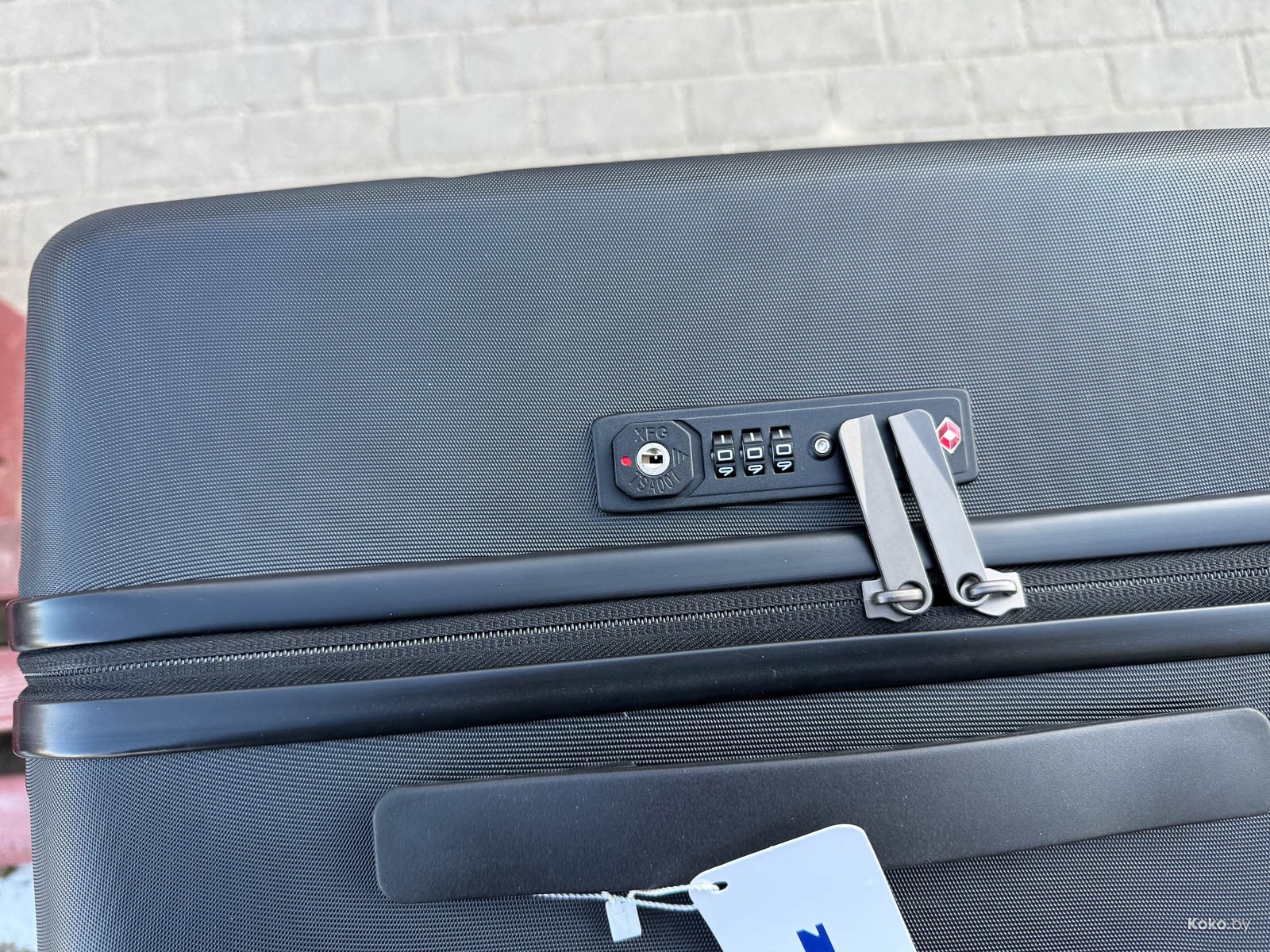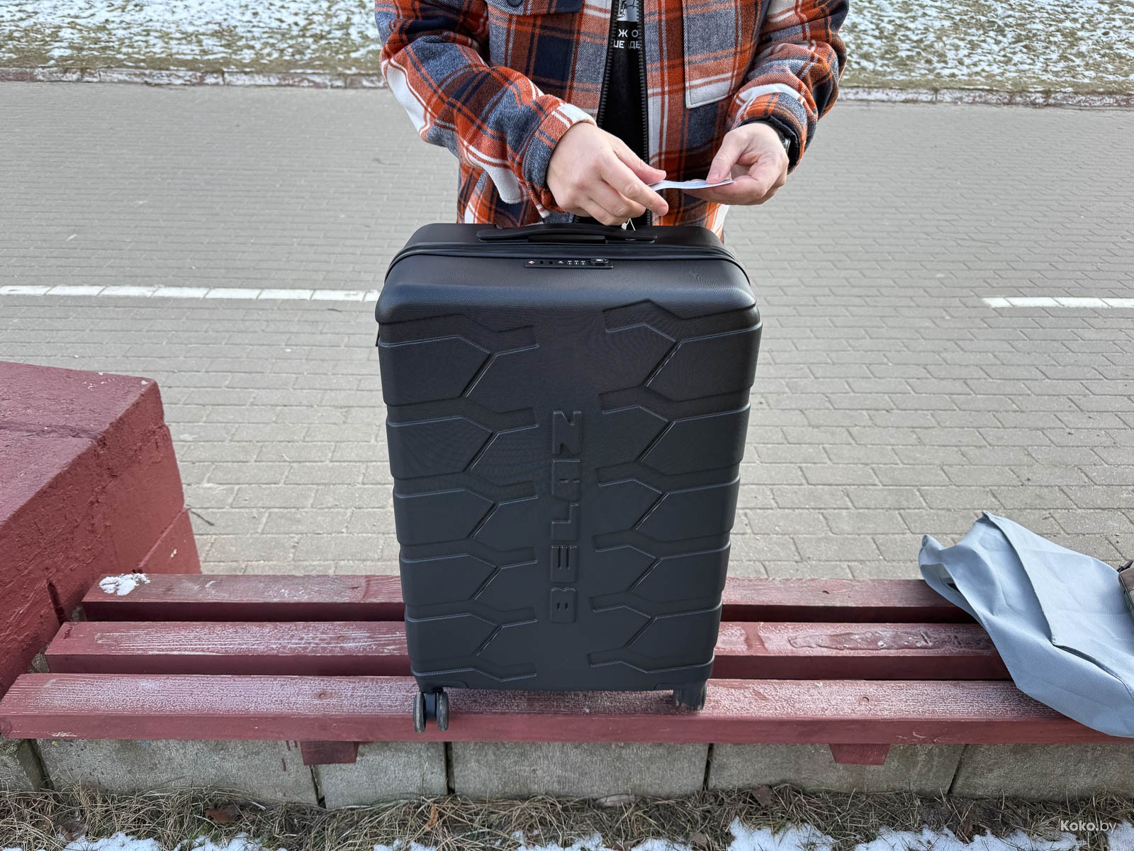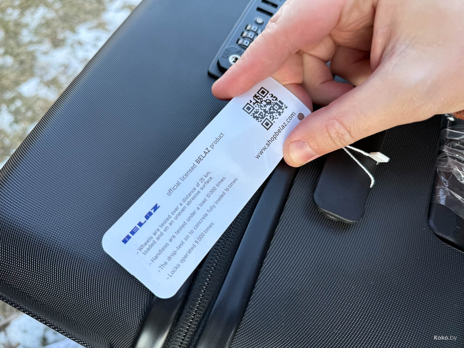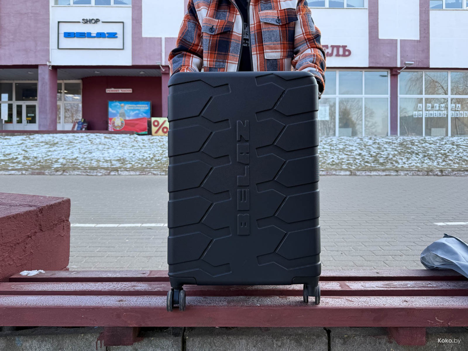 Корпус чемодана исполнили в форме протектора белазовских покрышек. На ощупь прочный, материал издалека напоминает кевлар. Проверим, как он переносит кидание в багаж самолёта грузчиками.