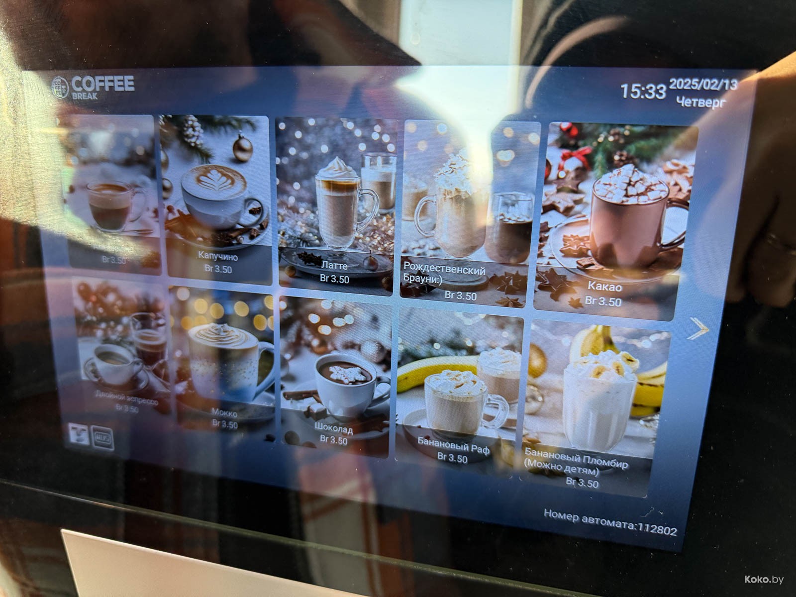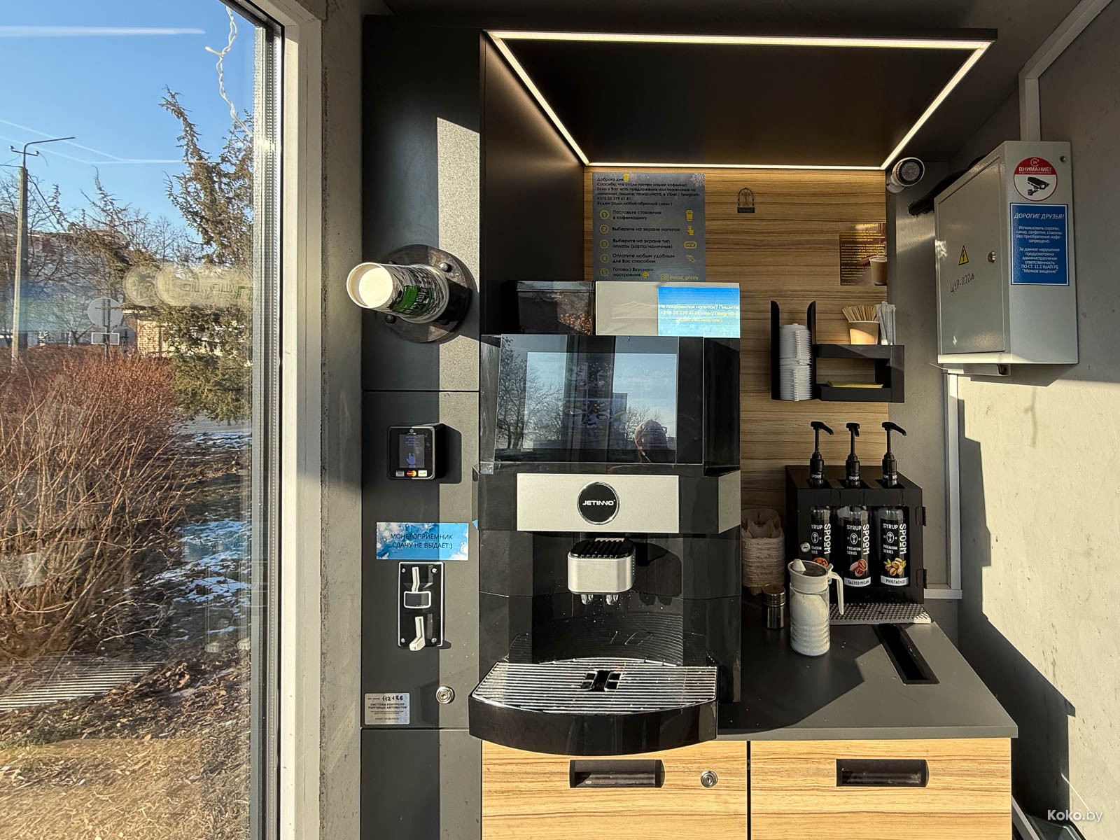 Кабинка чуть больше телефонной будки, внутри кофемашина, одноразовые стаканчики, сиропы, напольный обогреватель и большой брат наблюдает за мной. Автомат работает с картой и наличкой.