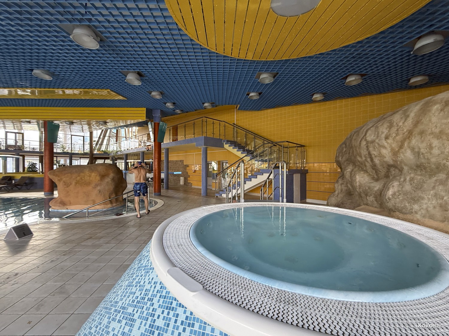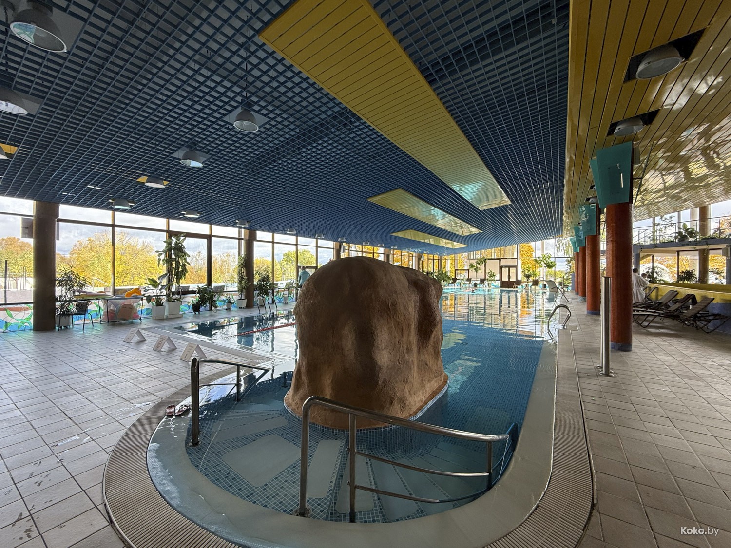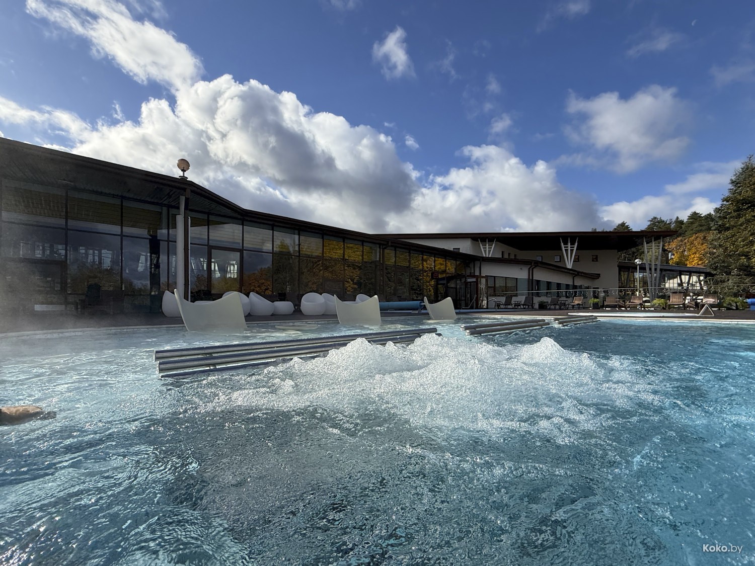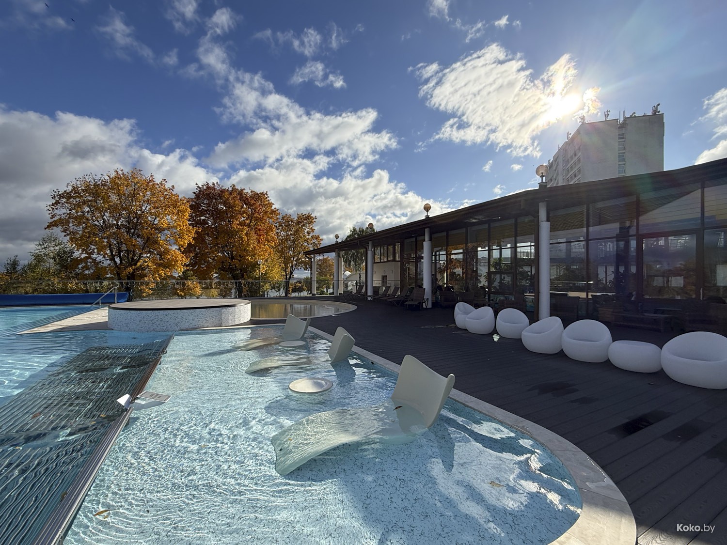 Сложно, потому что аналогов ему нет, в новой зоне отдыха санатория «Юность» находится подогреваемый 27-метровый бассейн с эффектом бесконечного края, большое булькающее джакузи, под водой лежаки с аэромассажем, и вечером всё это подсвечивается. Для малышей по щиколотку детская зона с искусственной волной, которая тоже подогревается. Вода не кипяток, но реально тёплая, даже выходить не хочется, умные часы показывают тридцать градусов под водой.