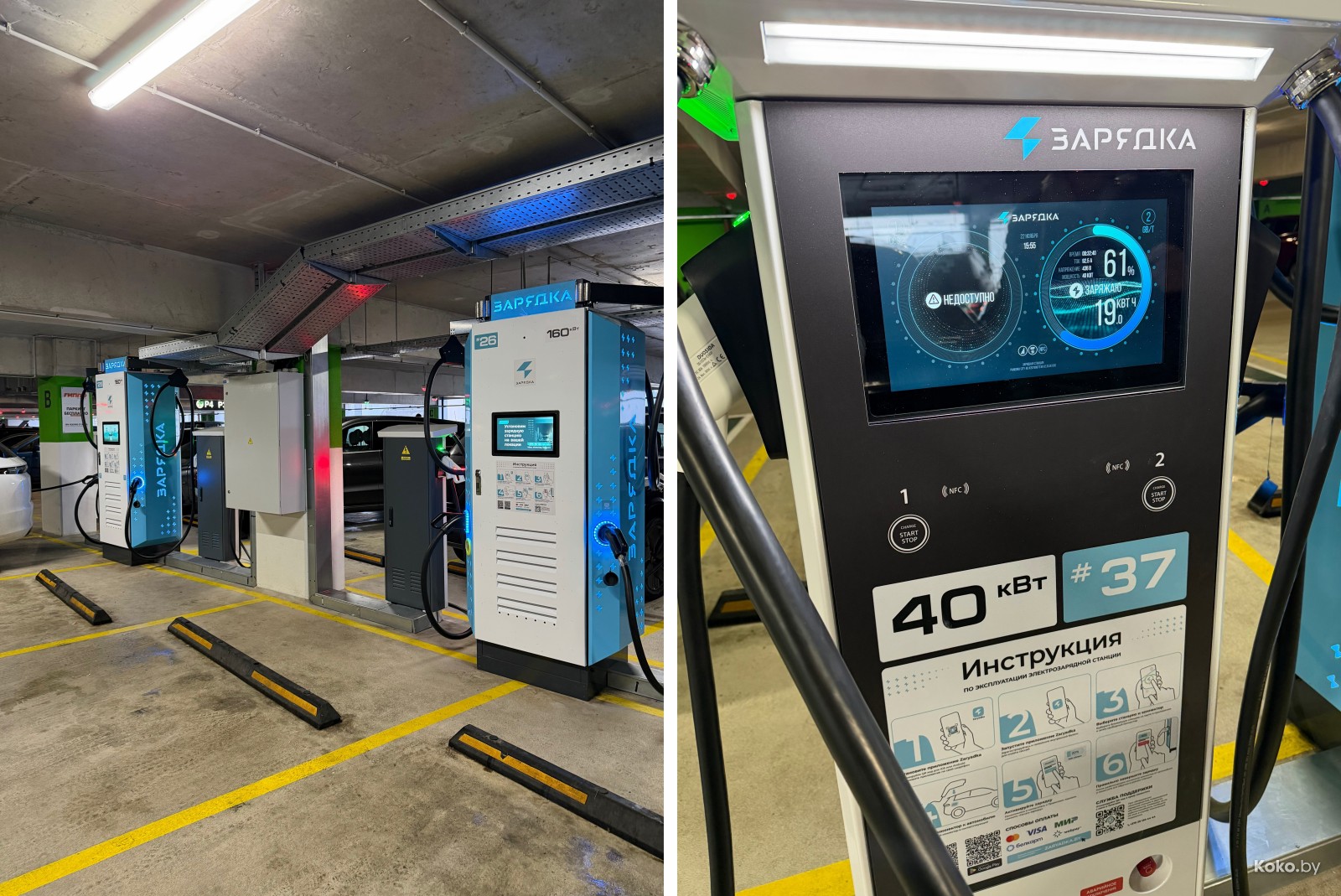 Хаб от «Зарядка» создали на третьем этаже рядом со входом в торговый центр. На сегодня из шестнадцати станций заряжать электрокары готовы десять, из них восемь по 40 кВт и две супербыстрые по 160 кВт, ко вторнику должны заступить на работу все. Главный, он же очевидный плюс электроавтомобилей - бесплатная парковка, в ТРЦ «Галерея Минск» - первые 3 часа платить не надо, а каждый последующий час обойдётся казне всего в 1 рубль.