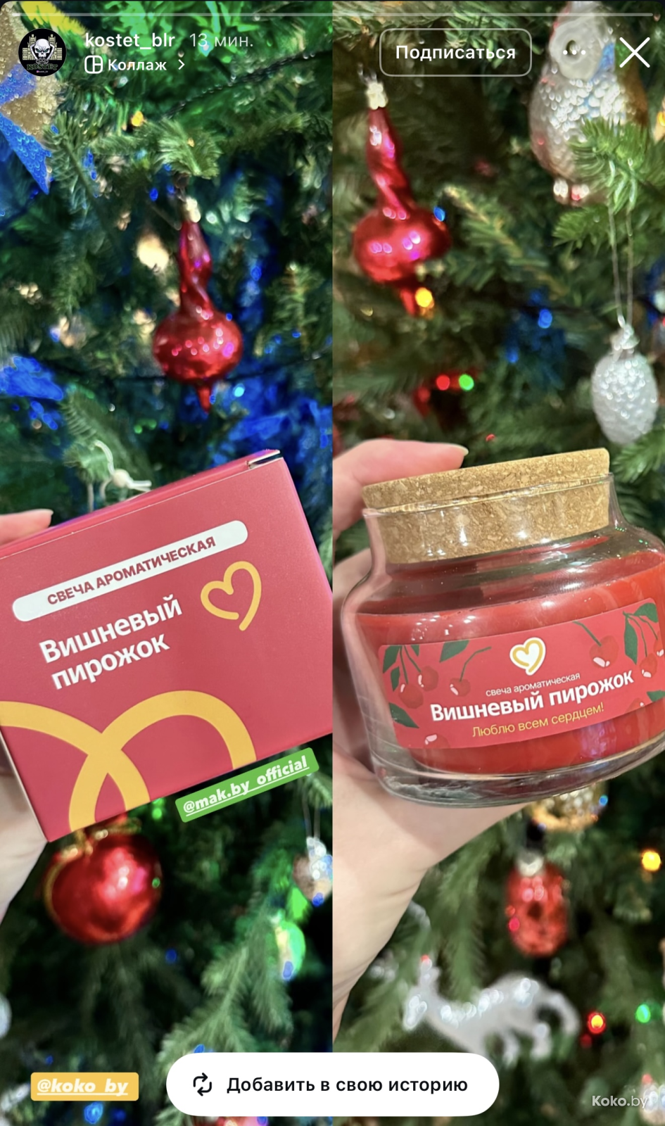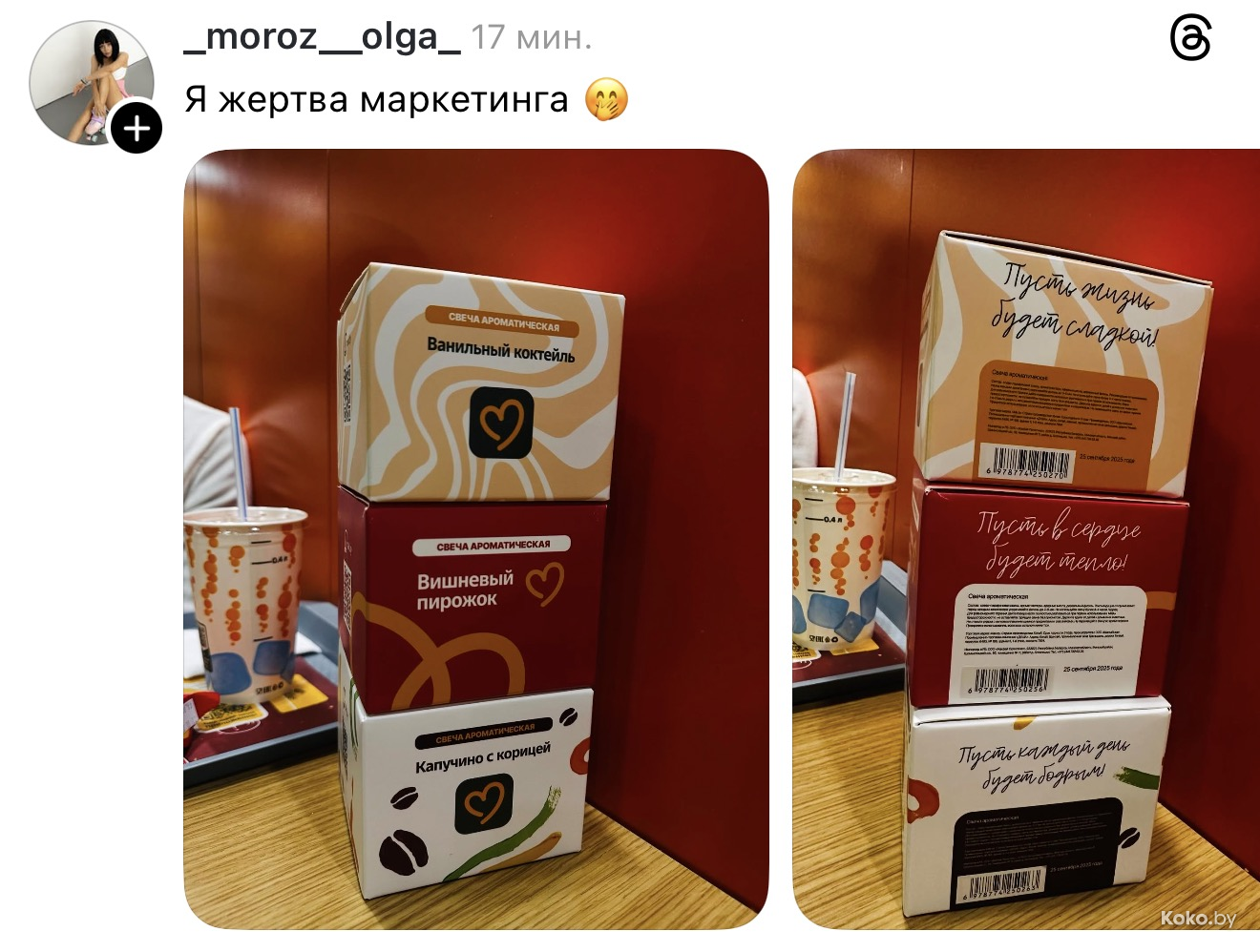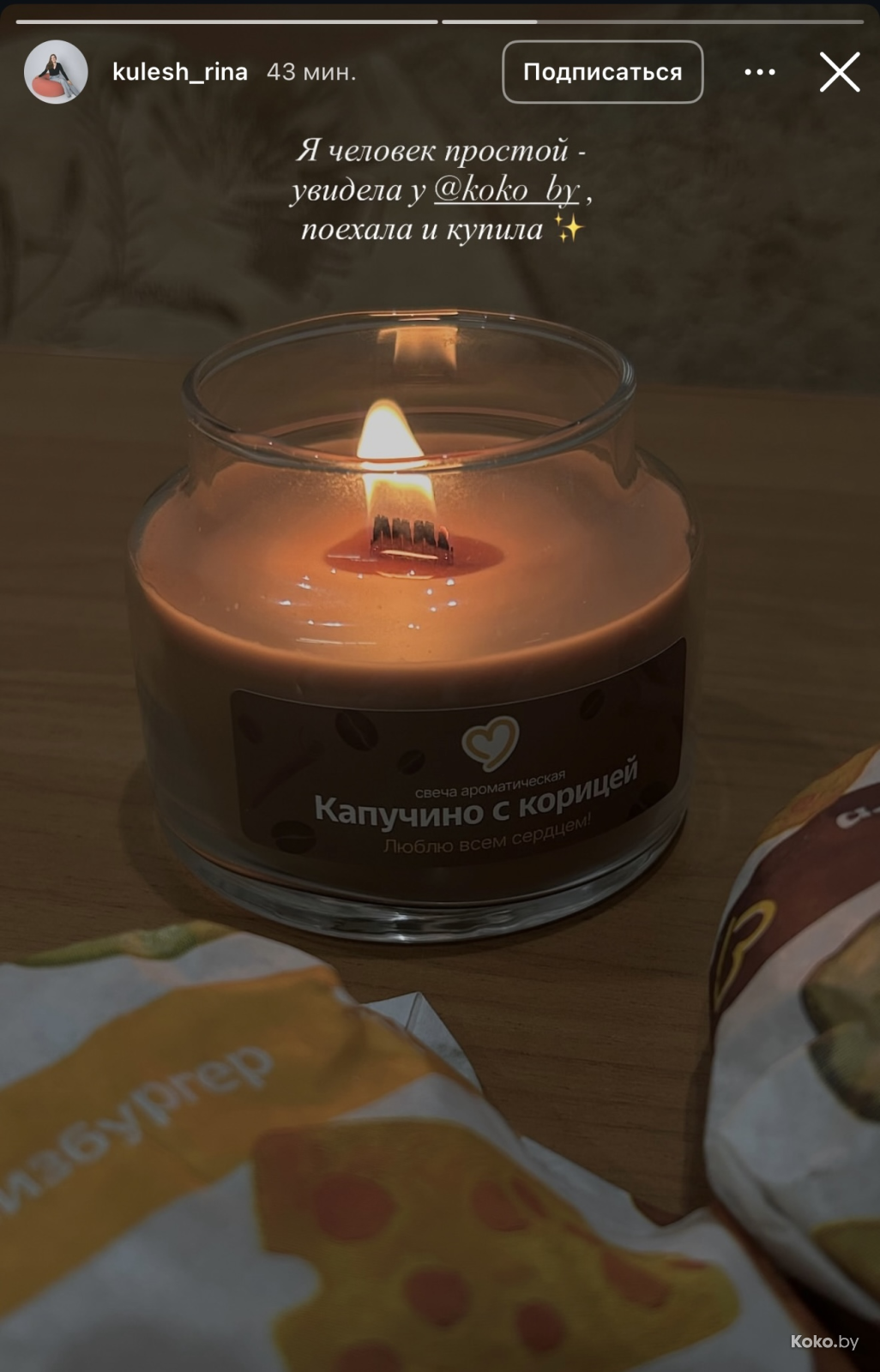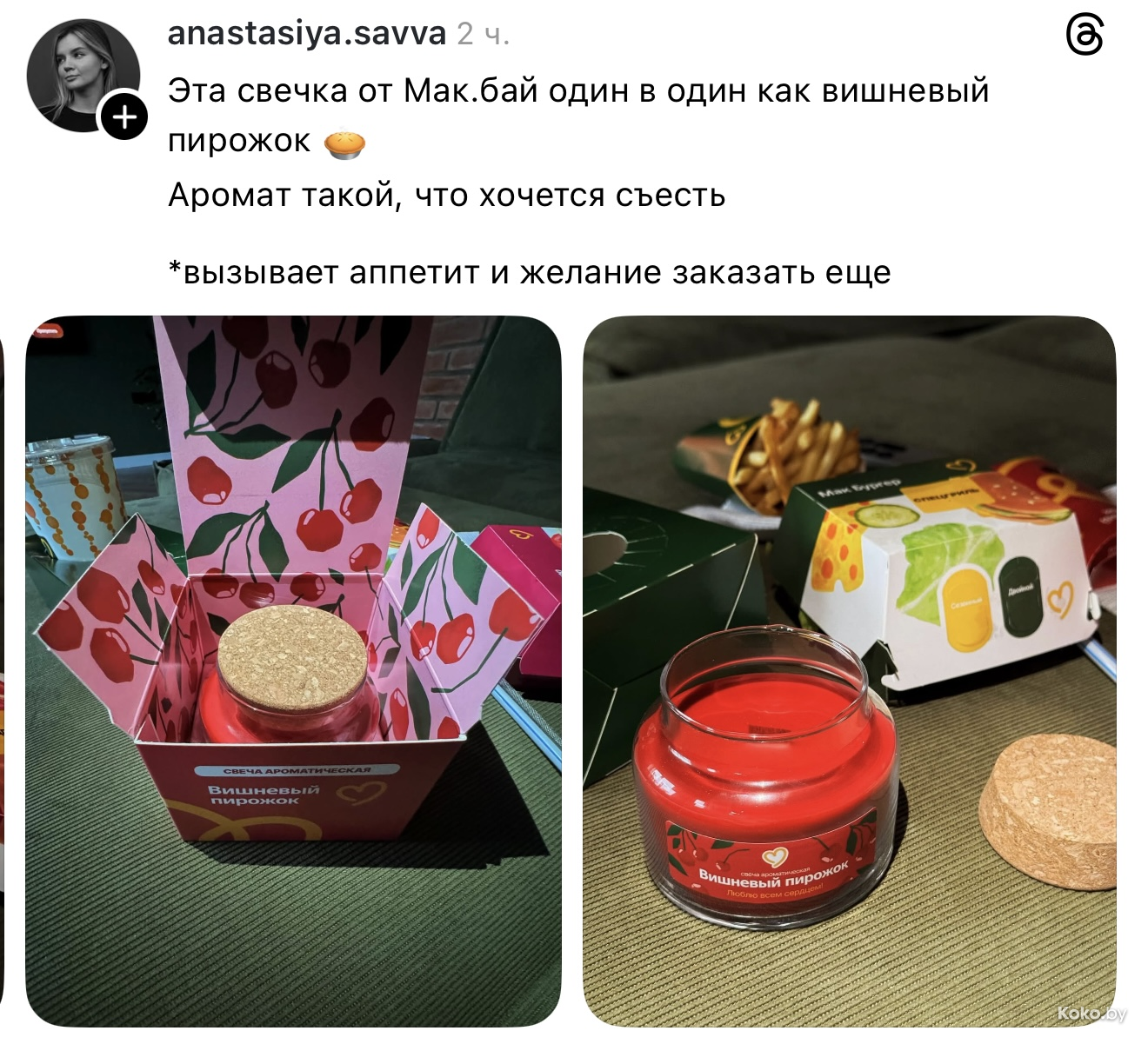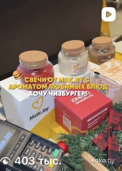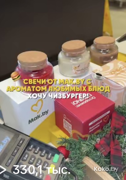 Утром 18 декабря во всех ресторанах «Mak.by» на кассах появились необычные свечи с ароматом кофе с корицей, вишнёвого пирожка и ванильного коктейля. Чтобы зажечь такую свечку дома, нужно купить Уютное комбо от 34р до 42,90р, цена зависит от того, насколько вы голодны. Каждая свеча находится в праздничной упаковке и, судя по объёму, готова гореть несколько дней, наполняя комнату ароматами кухни Макбая. Обзор со старта набрал сотни тысяч просмотров.