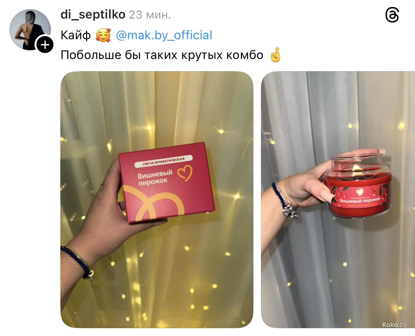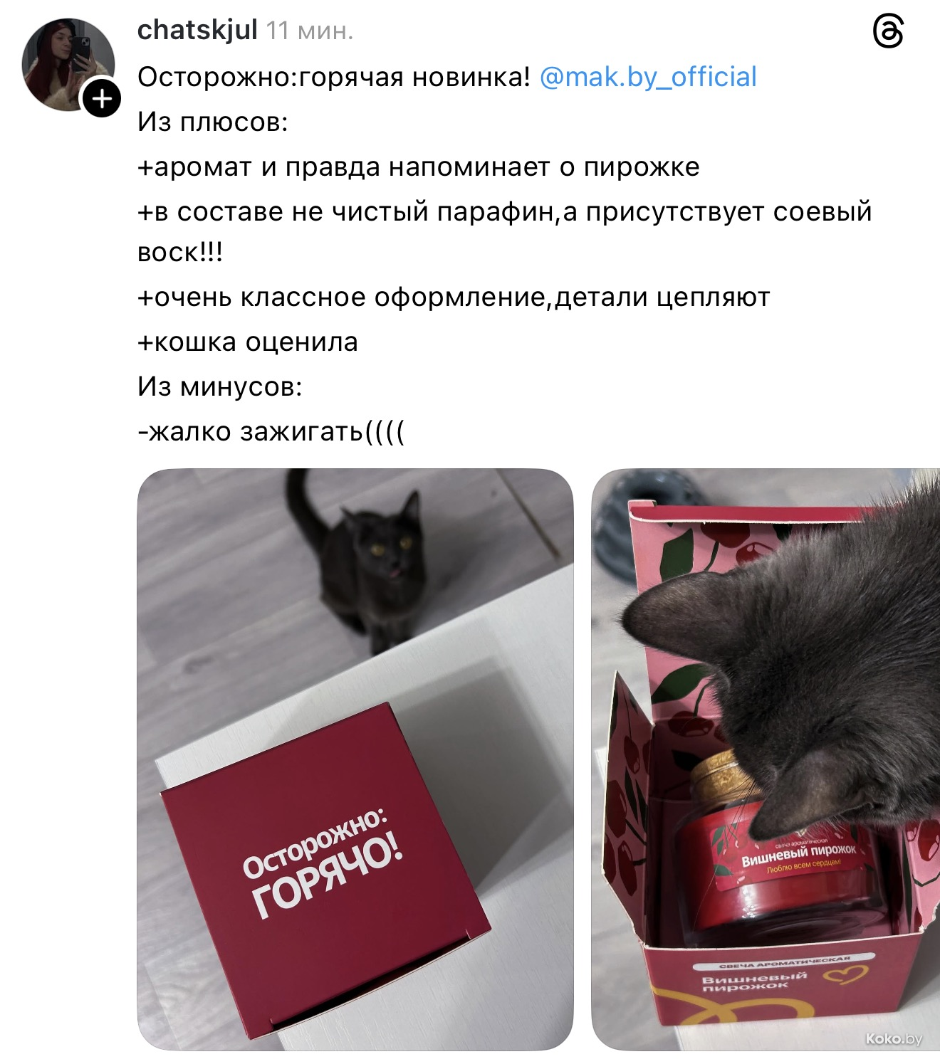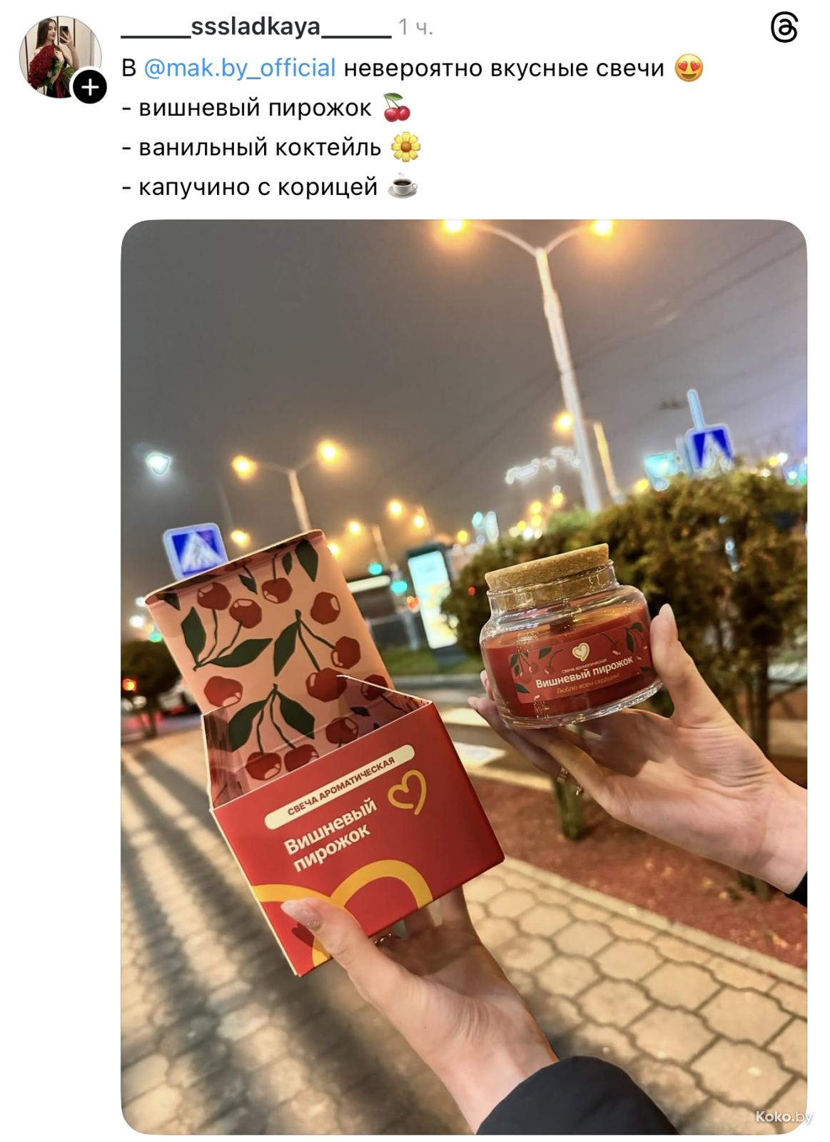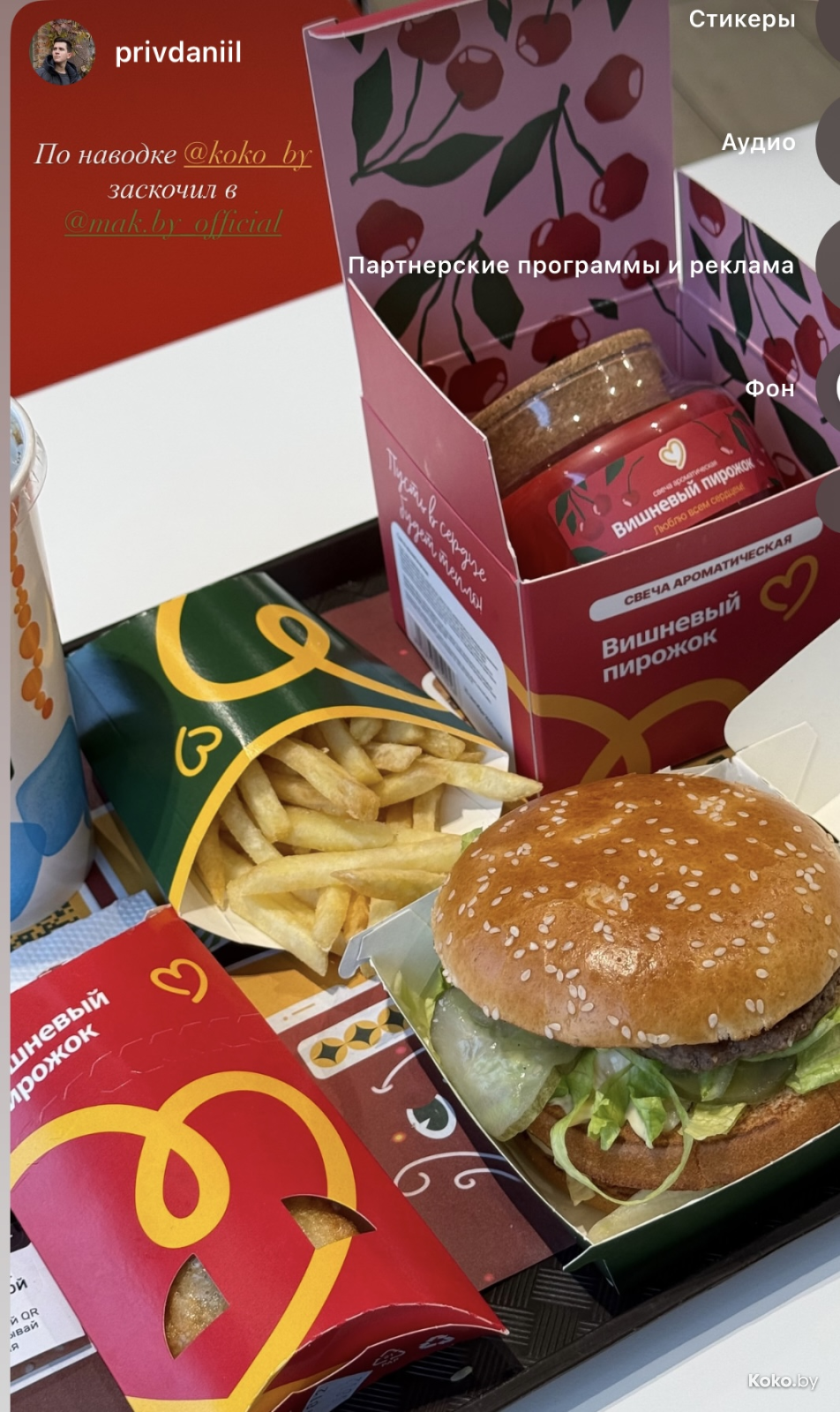 Утром 18 декабря во всех ресторанах «Mak.by» на кассах появились необычные свечи с ароматом кофе с корицей, вишнёвого пирожка и ванильного коктейля. Чтобы зажечь такую свечку дома, нужно купить Уютное комбо от 34р до 42,90р, цена зависит от того, насколько вы голодны. Каждая свеча находится в праздничной упаковке и, судя по объёму, готова гореть несколько дней, наполняя комнату ароматами кухни Макбая. Обзор со старта набрал сотни тысяч просмотров.