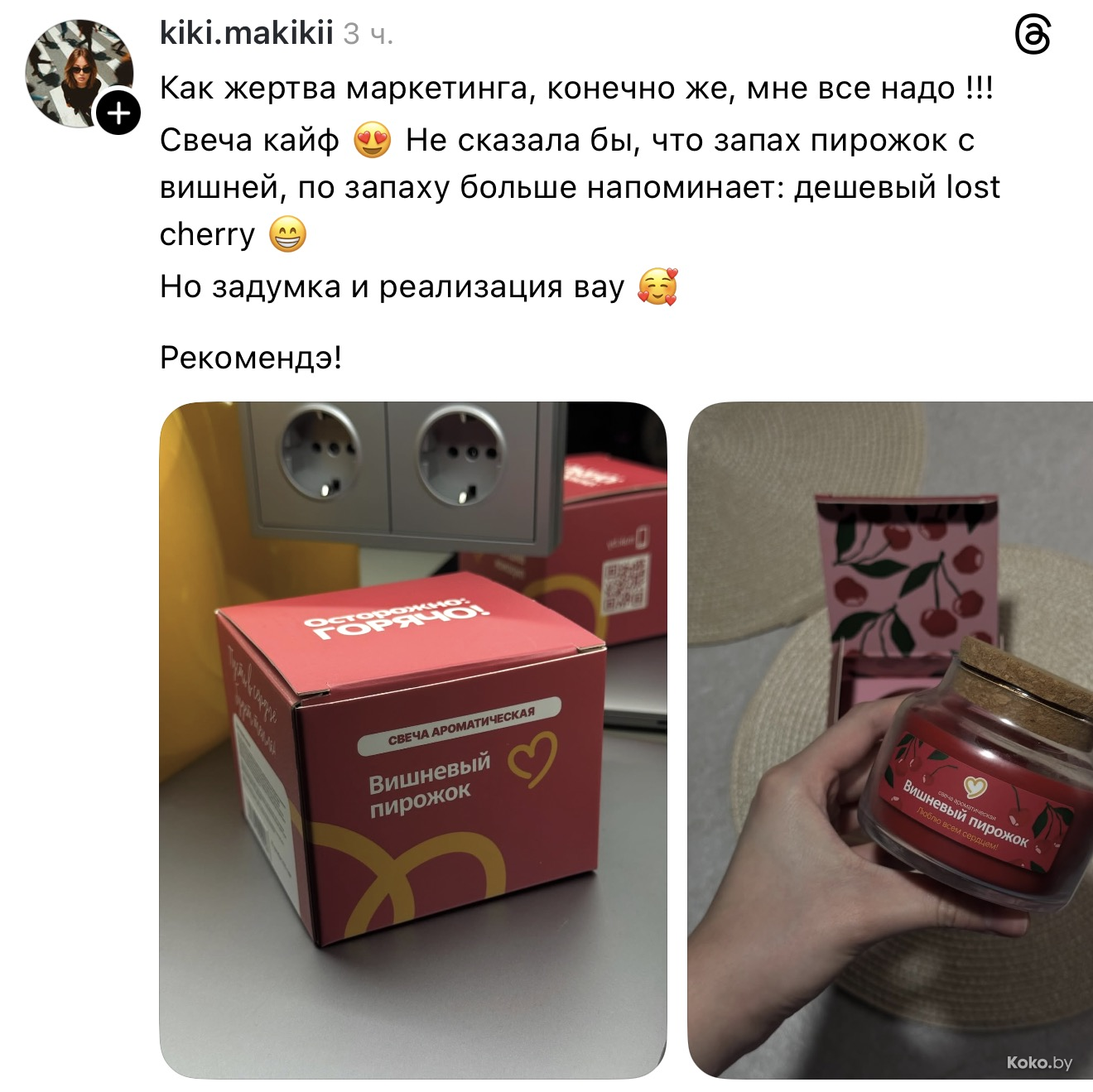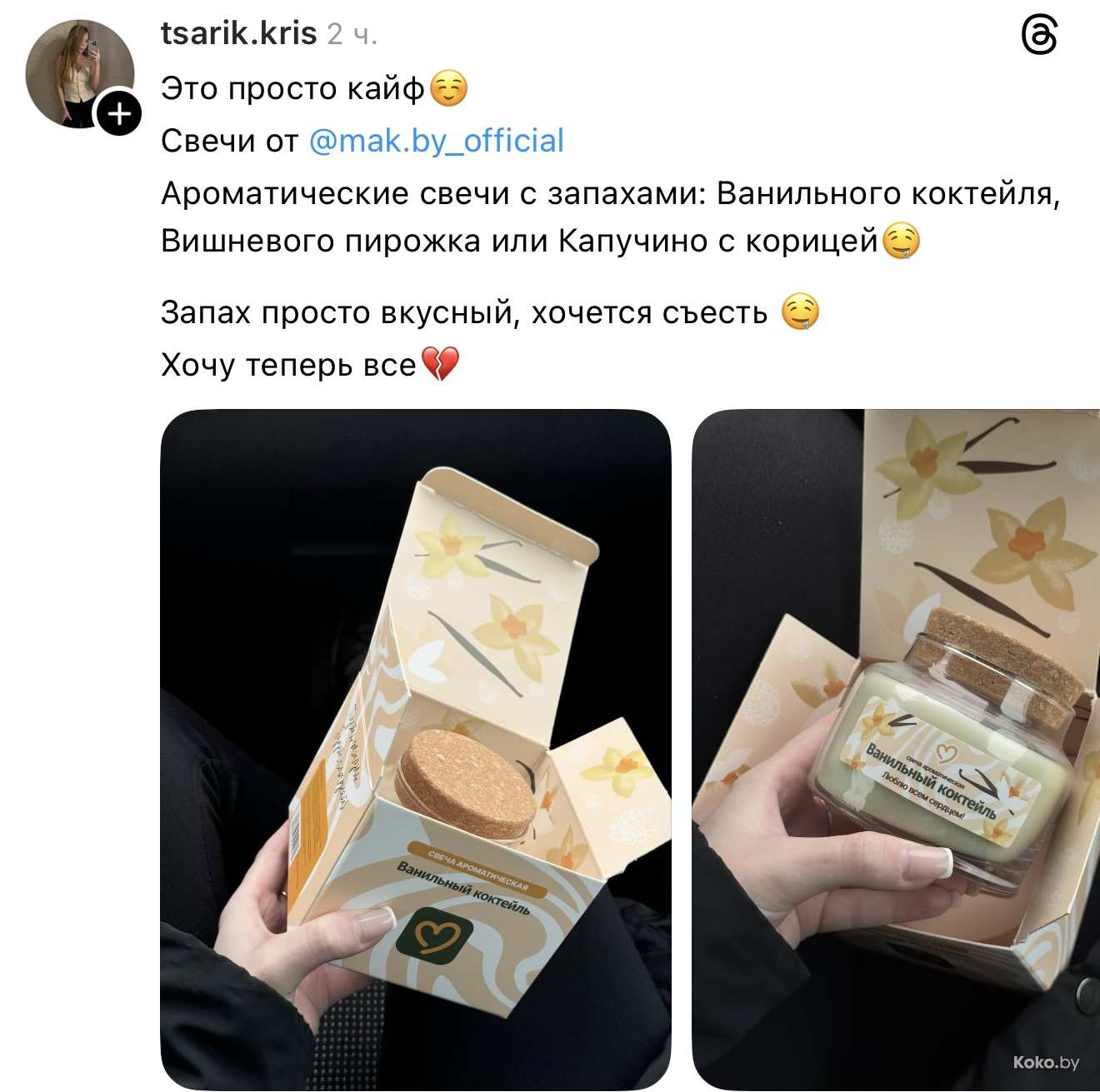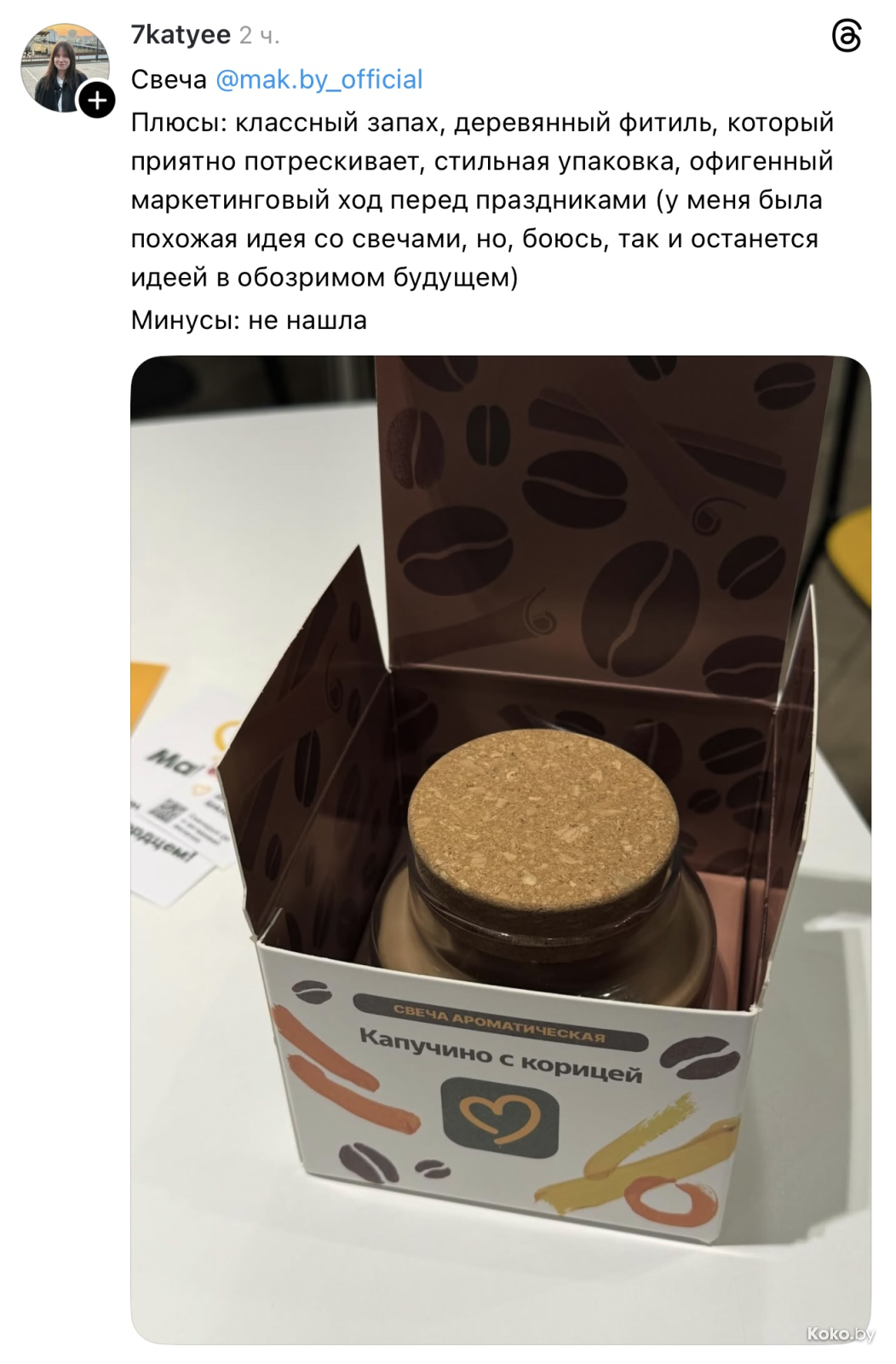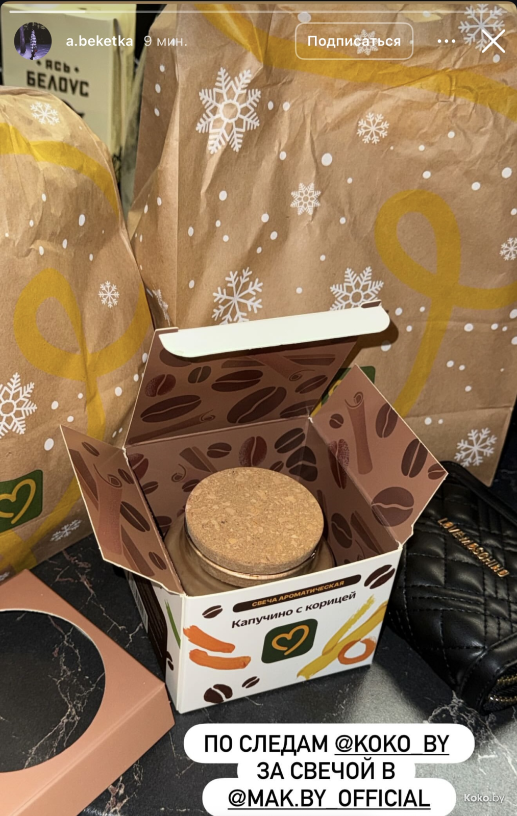 Утром 18 декабря во всех ресторанах «Mak.by» на кассах появились необычные свечи с ароматом кофе с корицей, вишнёвого пирожка и ванильного коктейля. Чтобы зажечь такую свечку дома, нужно купить Уютное комбо от 34р до 42,90р, цена зависит от того, насколько вы голодны. Каждая свеча находится в праздничной упаковке и, судя по объёму, готова гореть несколько дней, наполняя комнату ароматами кухни Макбая. Обзор со старта набрал сотни тысяч просмотров.