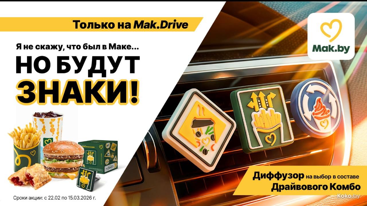 Только на драйве, от 29,20р в зависимости от выбора: Мак Бургер или Гранд Чиз или Двойной Чиз, на завтрак - Двойной Маффин со свининой, средняя порция фри, попить на выбор, пирожок и вот аромадиффузор.