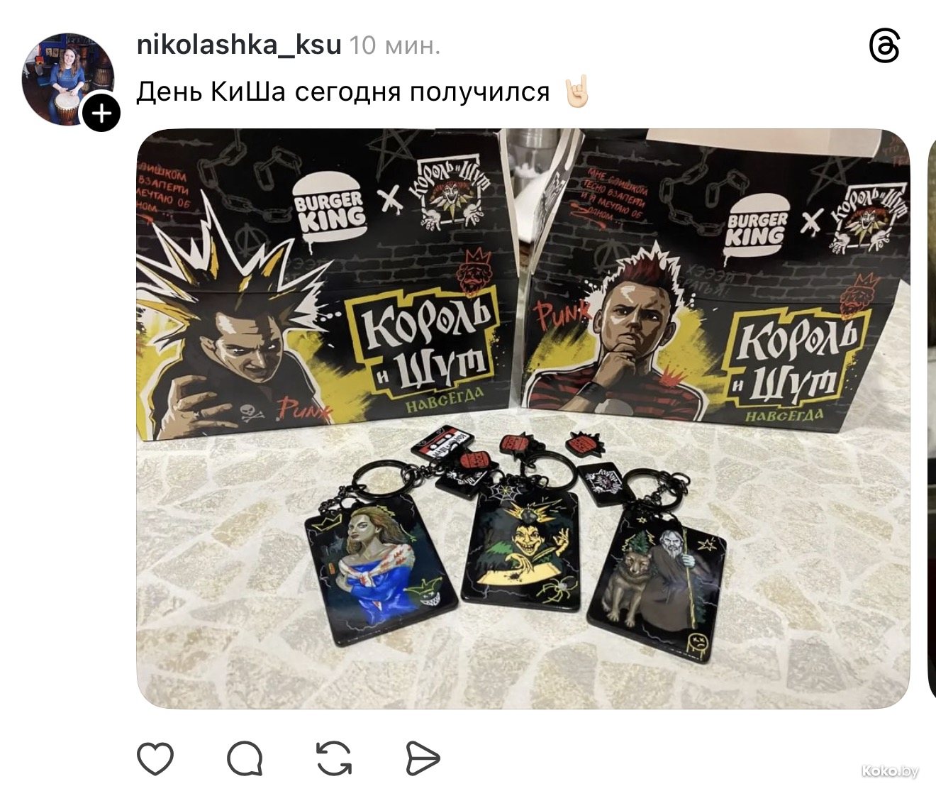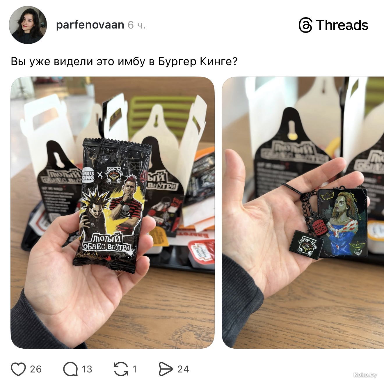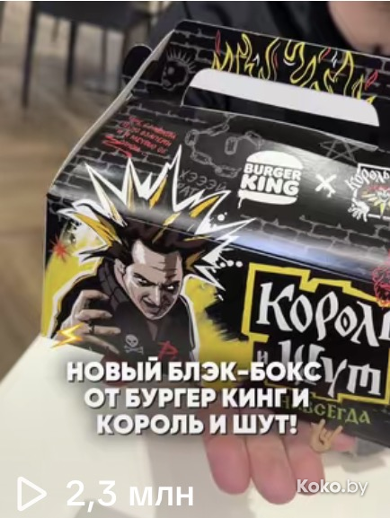 Стоит он 26р, внутри лимитированный чёрный Воппер с чёрным сыром, картошка фри (лучшая среди фастфуда), напиток, корона и самое желанное - панковский брелок с отрывками песен КИШа, всего их семь.