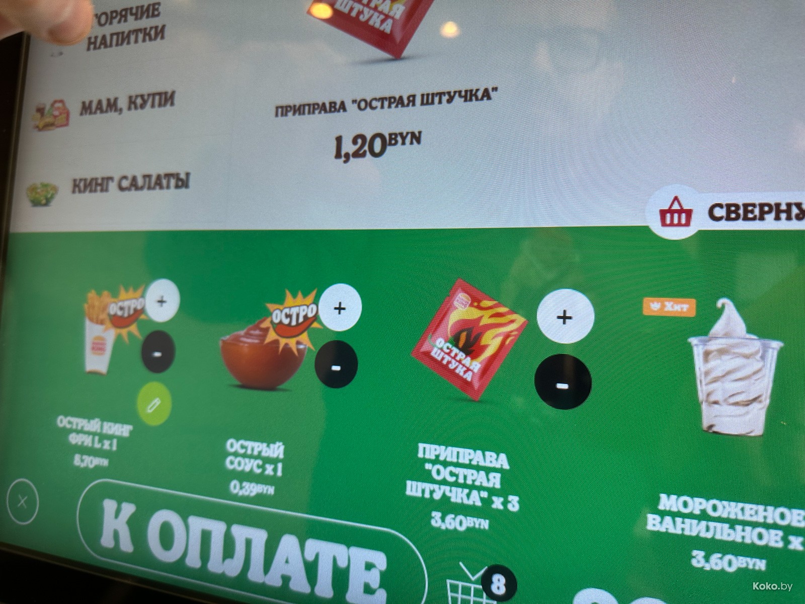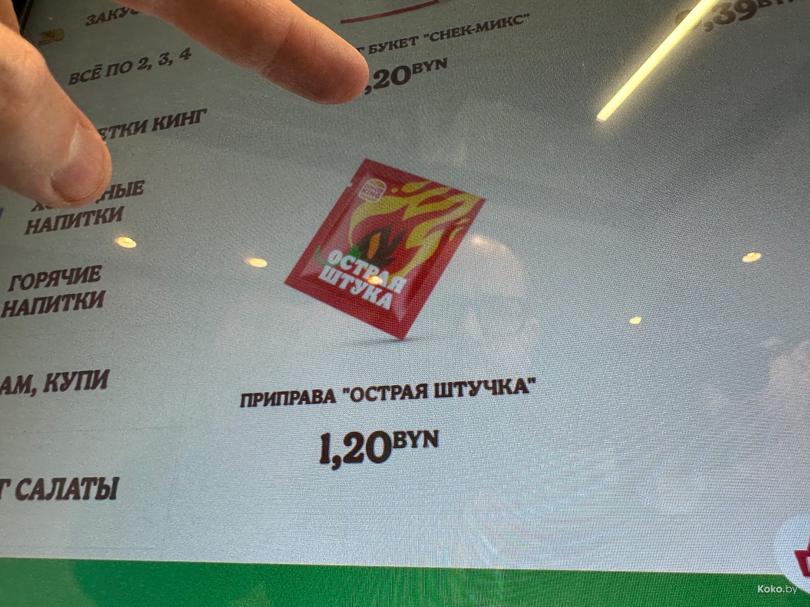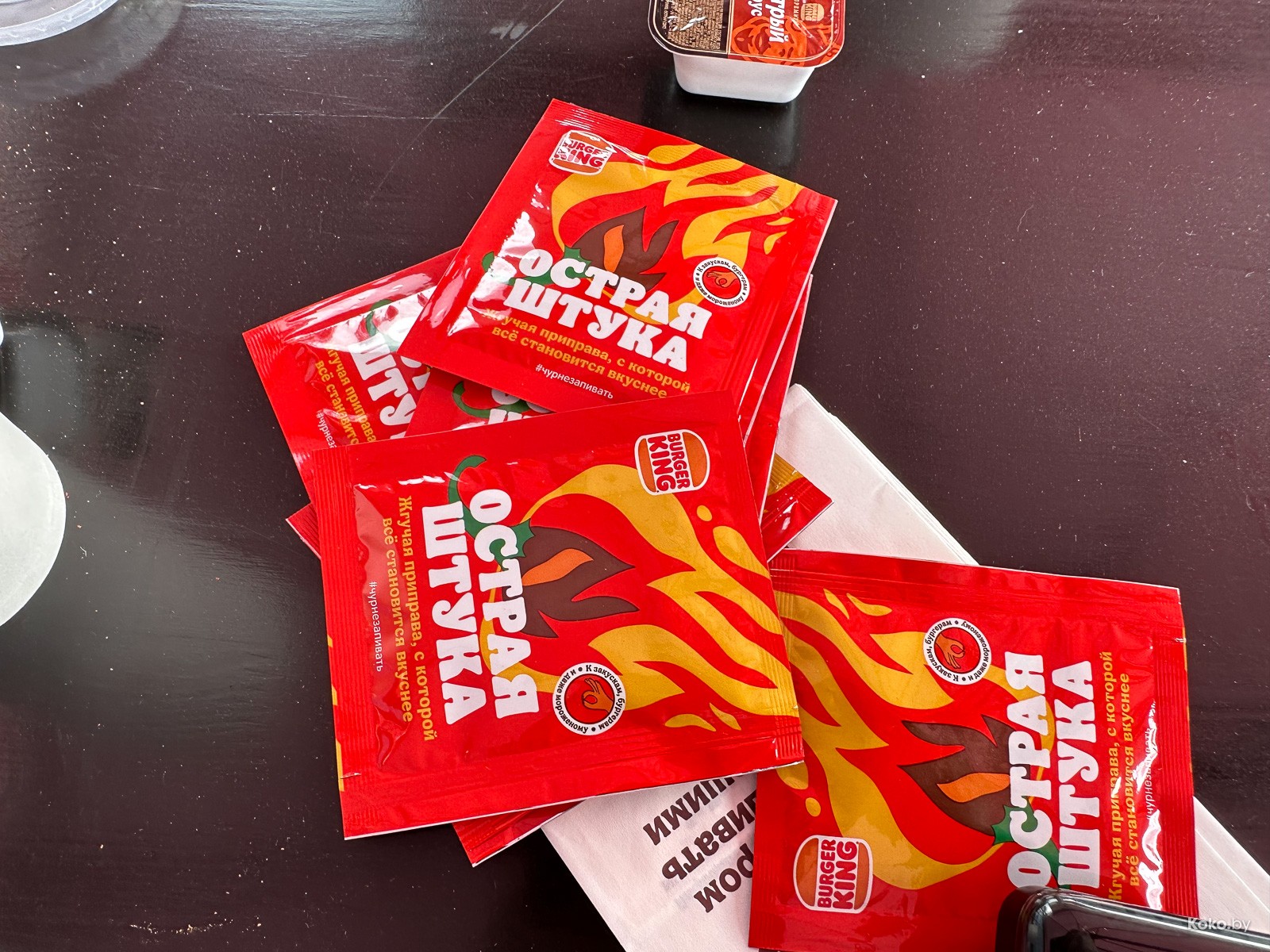 Решил проверить, так ли это остро и вкусно. Баночным соусом «Хайнц» особо не удивишь, лишь ценой в 2 byn! А вот красный пакетик с каким-то порошком, это уже интересненько. Под девизом «Сделай остро», спасибо, что смотри не обострись, в меню появились две новинки, которые можно добавить в любое блюдо. Приправа за 1,20byn из смеси красного перца, чили, паприки, чеснока, лука и прочего. Вторая - из чёрного перца, с чили и мускатным орехом.