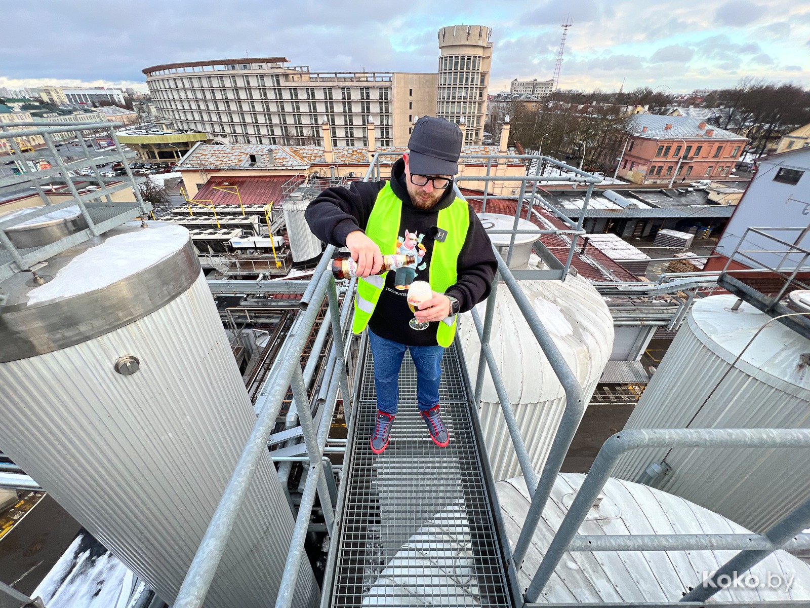 Волнуюсь, ведь сегодня мы поднимемся туда, куда посторонних никогда не пускали. Чтобы попасть на экскурсию по заводу «Аливария» необязательно быть блогером. Достаточно собрать группу из 10 человек и зажать в кулачке по 20byn со взрослых и по 16byn, если студент, с дегустацией - по 25byn. После, вас, как нас, переоденут в костюм младшего сотрудника, выдадут жилетку, очки, перчатки, а на голову натянут каскетку - это симбиоз кепки с каской.