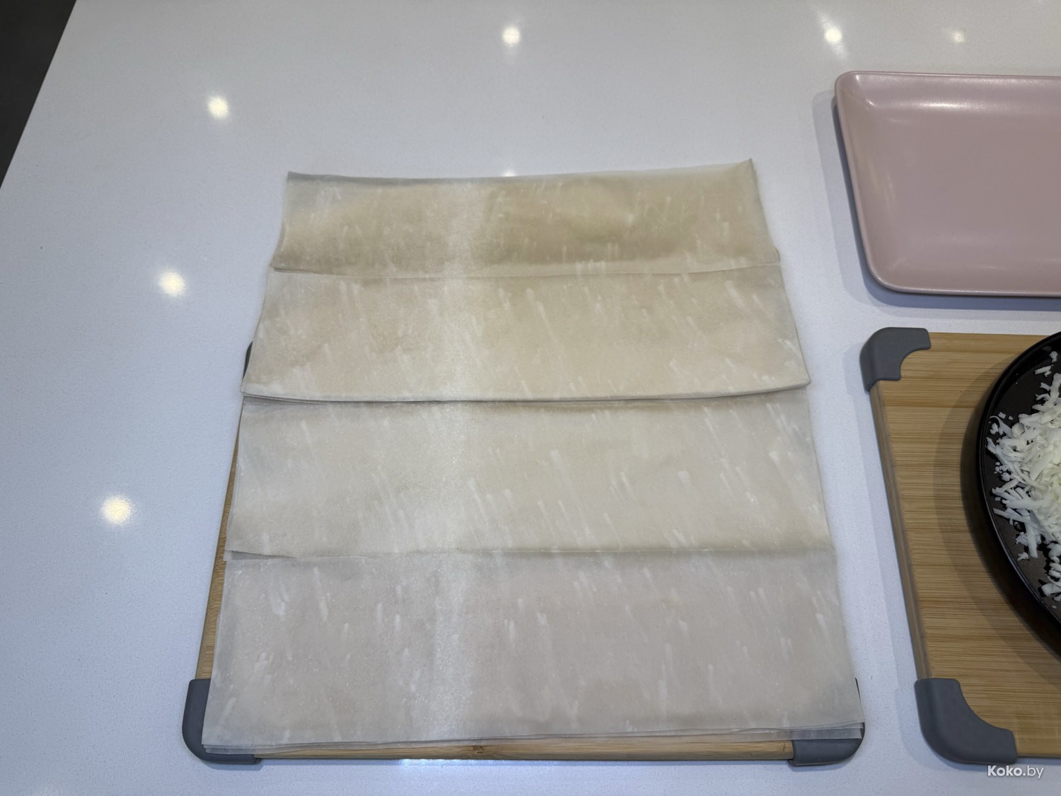 1. Разворачиваем тесто фило на доску. Важно, не дайте ему засохнуть. Отсчитываем 4 - 5 листиков, сверху кладем одну колбаску.