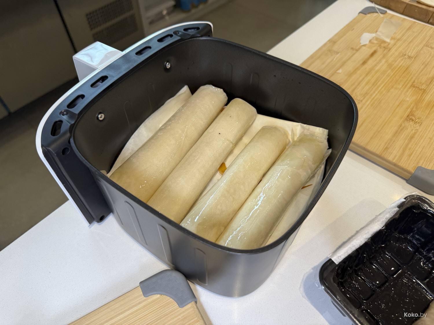 3. Скручиваем в ролл, выкладываем на пергамент в чашу аэрогриля.