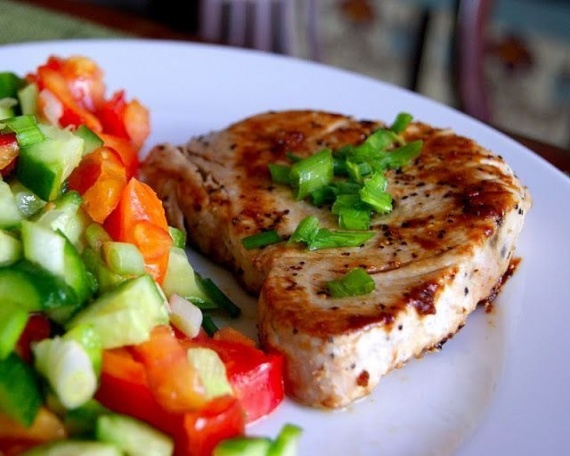Подавайте тунца с овощным салатом, украсив мелко нарезанным зеленым луком.