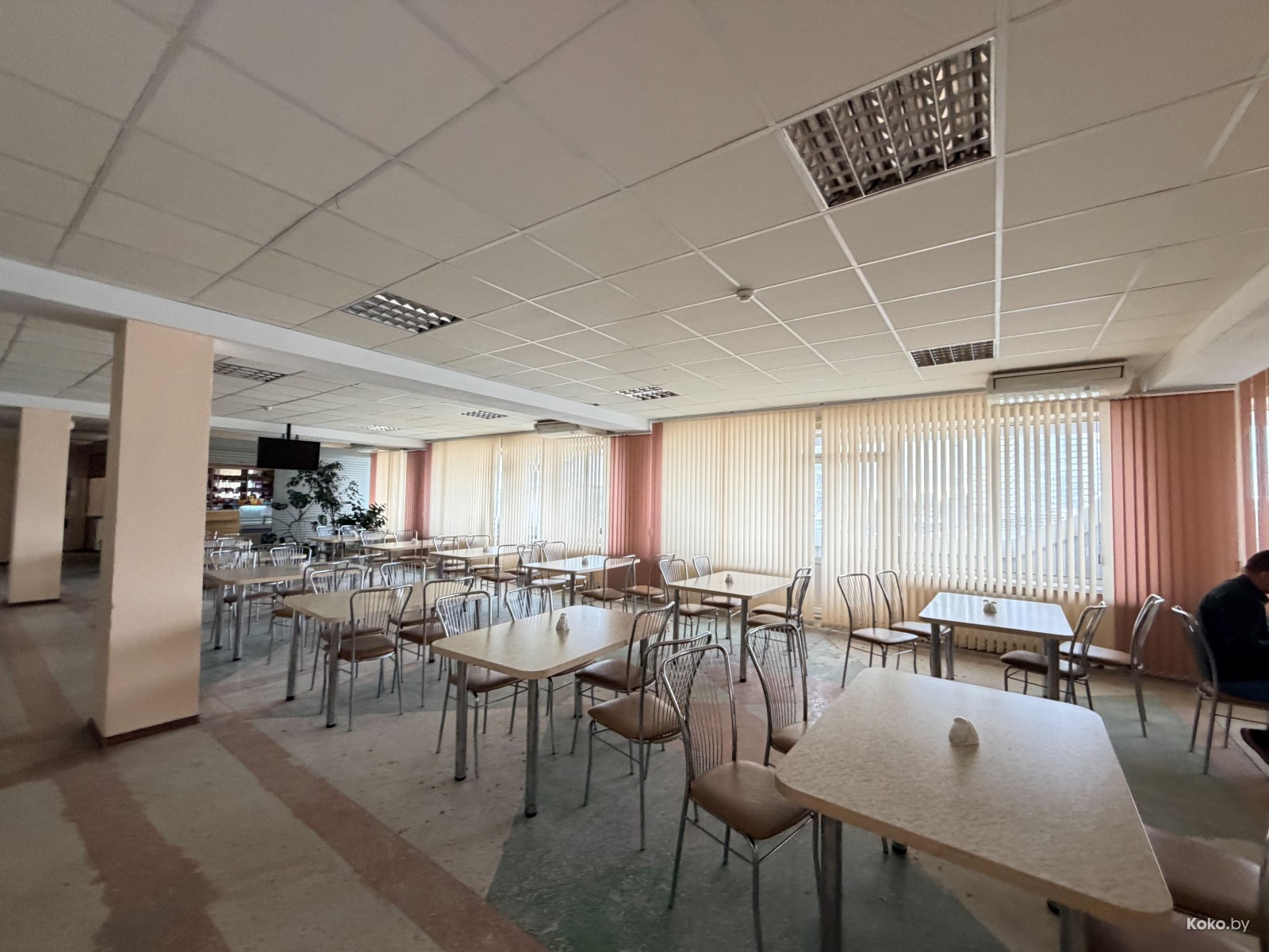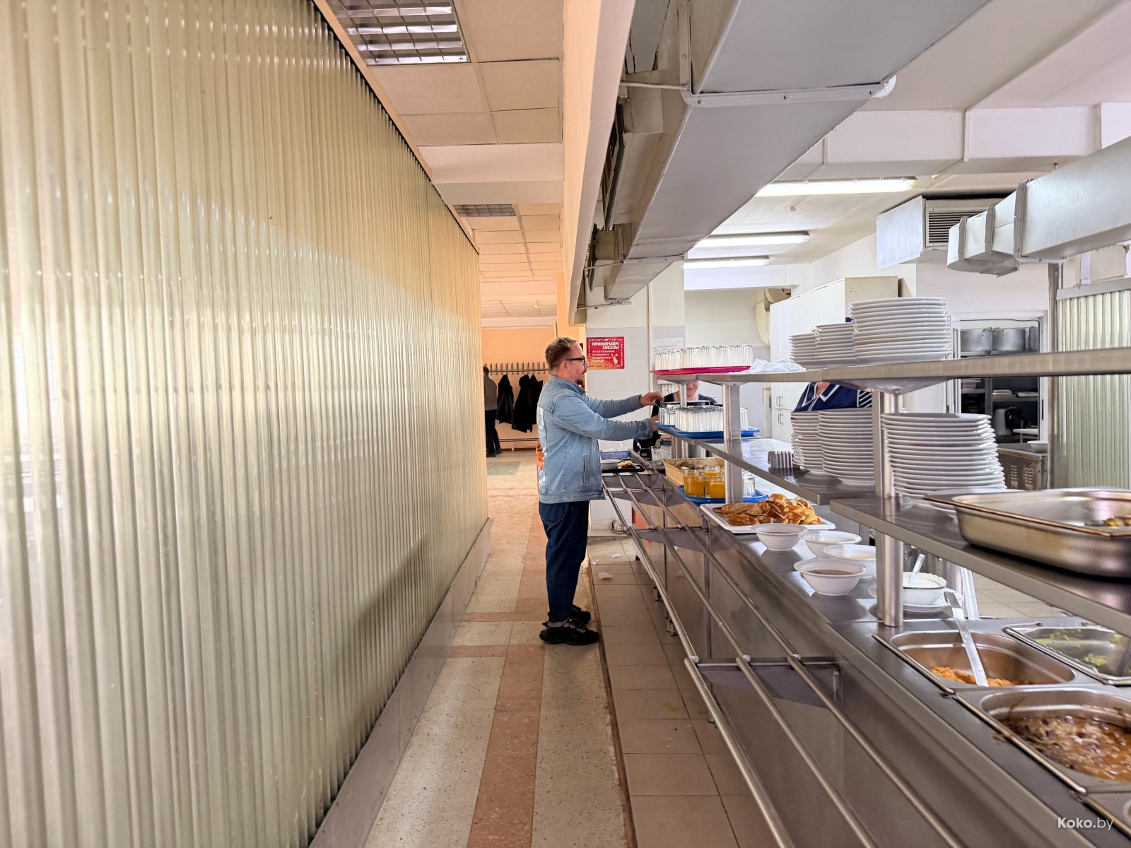 По правую руку линия раздачи с открытой кухней, слева просторный оупен спейс для приёма вовнутрь того, что поставил себе на поднос.
