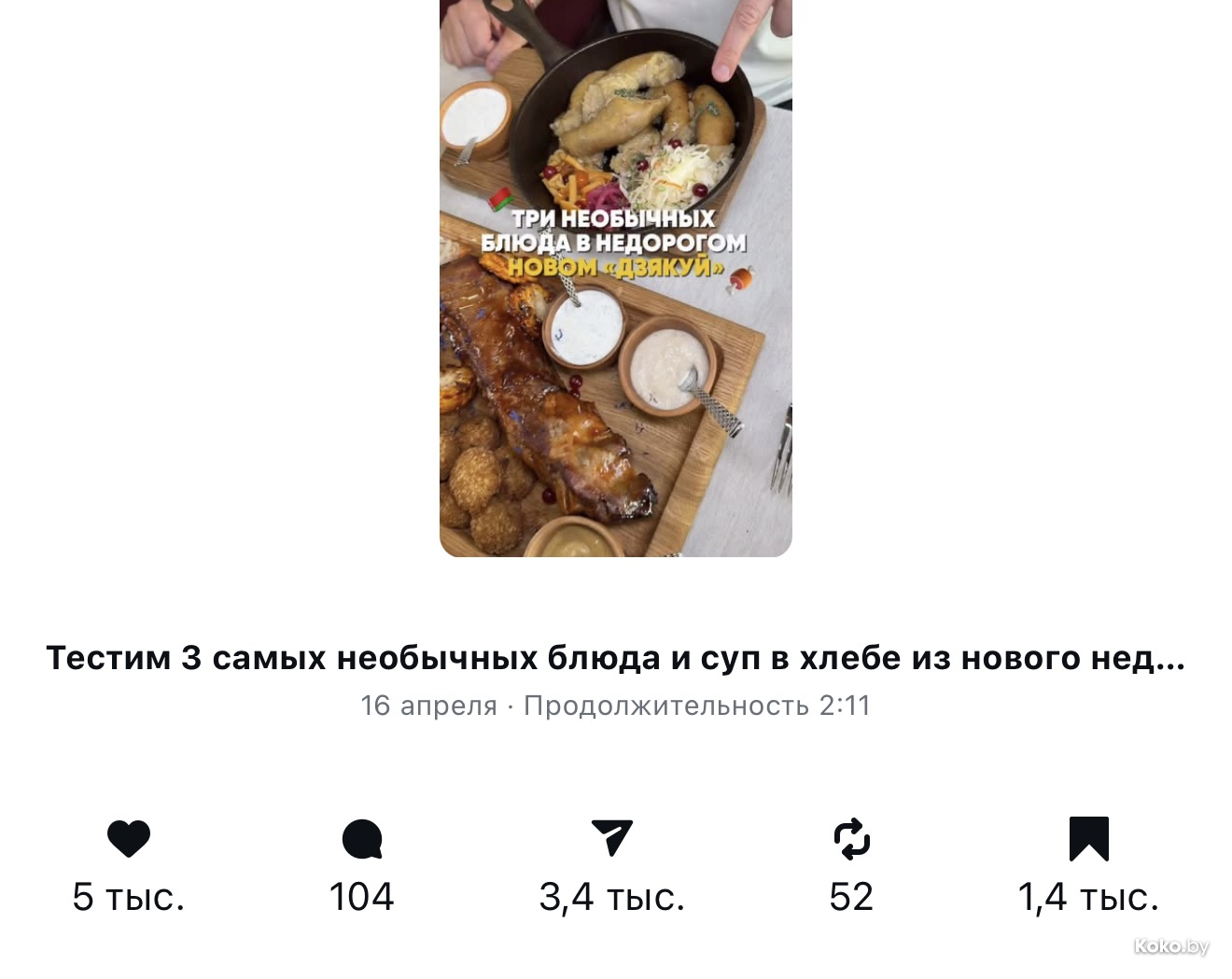Белорусская кухня манит белорусов, судя по рекордному количеству сохранений обзора на новый деревенский ресторан «Дзякуй».